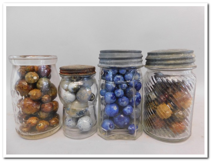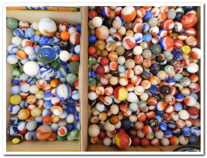 items, aluminum Christmas trees, lots of marbles, dated coverlets, quilts