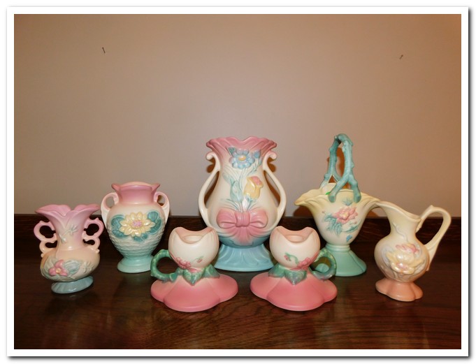 of Franciscan Desert Rose dishes, Roseville baskets, Hull pottery, lot of