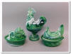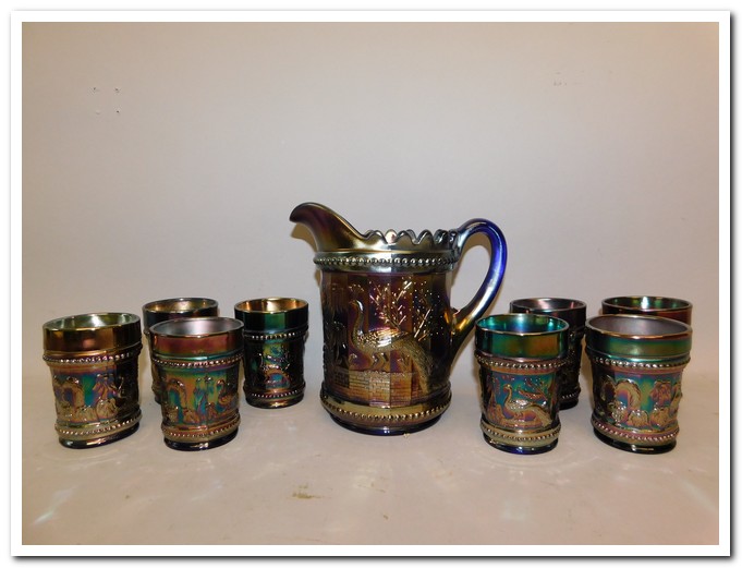Carnival glass Peacock at Fountain water set, Fenton glass, Aladdin kerosene